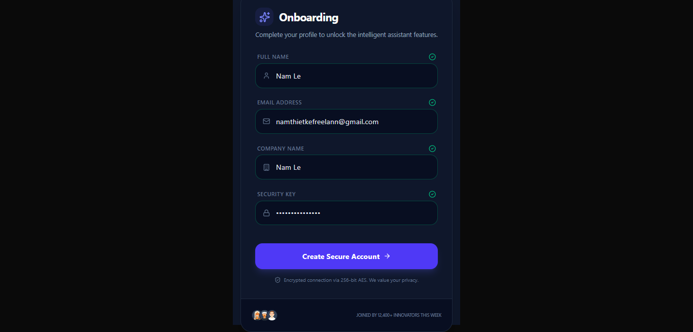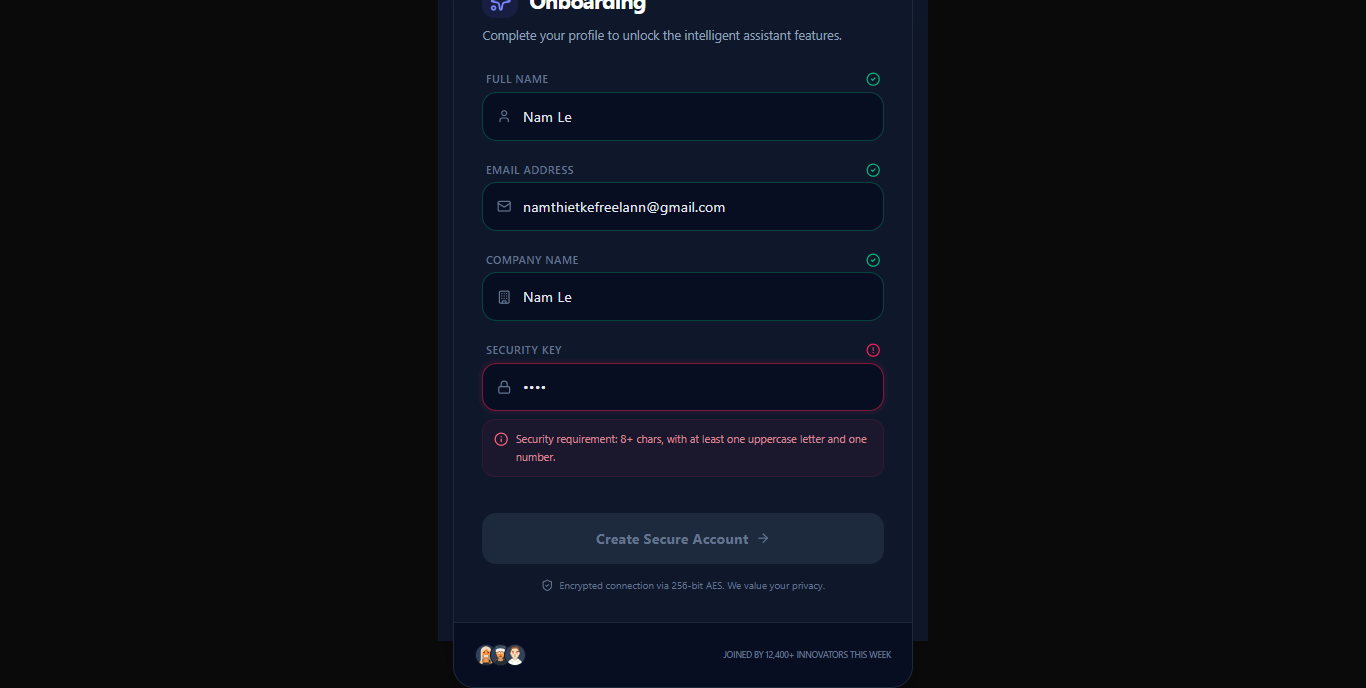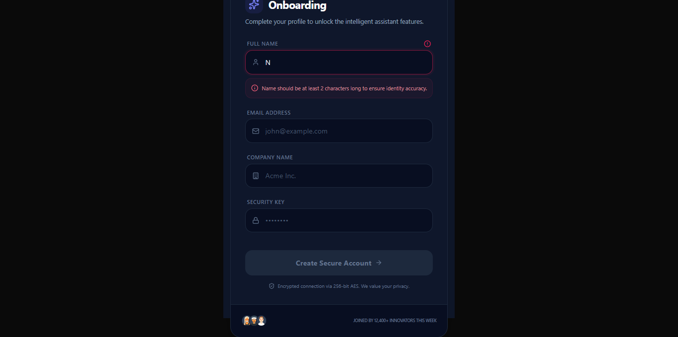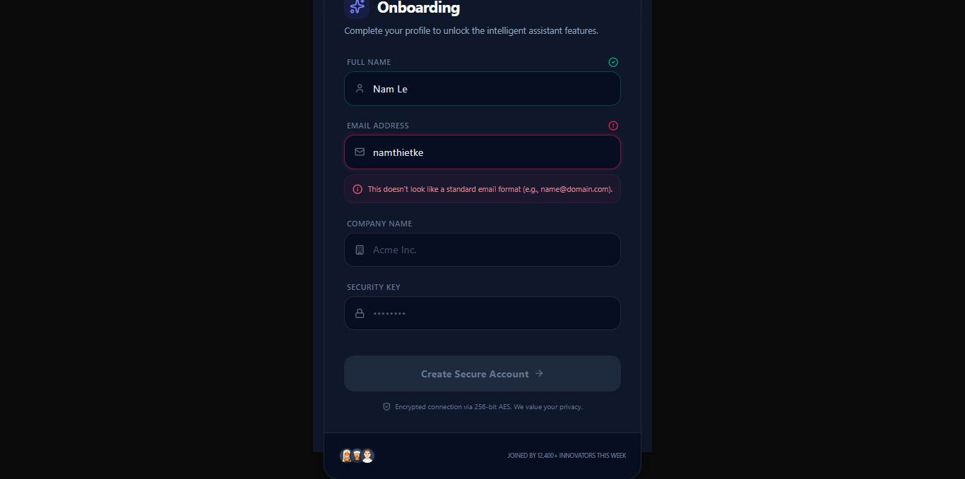 Một thành phần biểu mẫu có khả năng dự đoán các trường cần điền, tự động điền thông tin một cách an toàn, xác thực dữ liệu theo thời gian thực và giải thích rõ vì sao việc xác thực bị lỗi. Phần diễn giải ngắn gọn, dễ hiểu giúp giảm bực bội và giảm đáng kể tình trạng người dùng bỏ dở biểu mẫu.