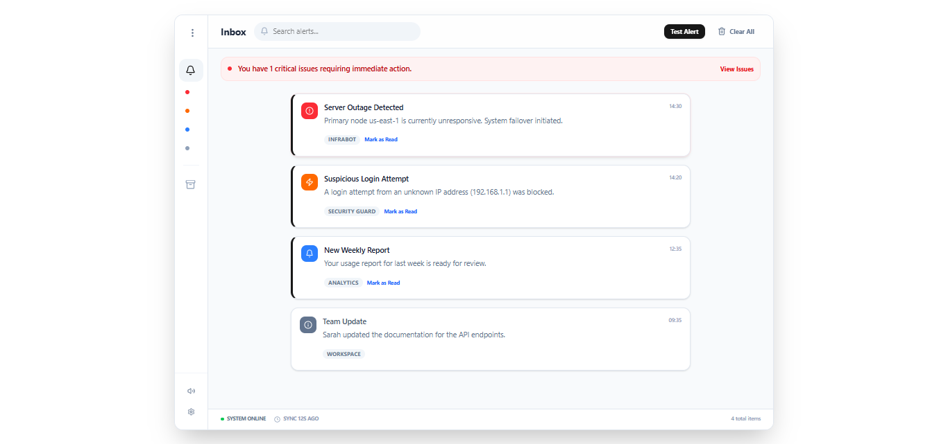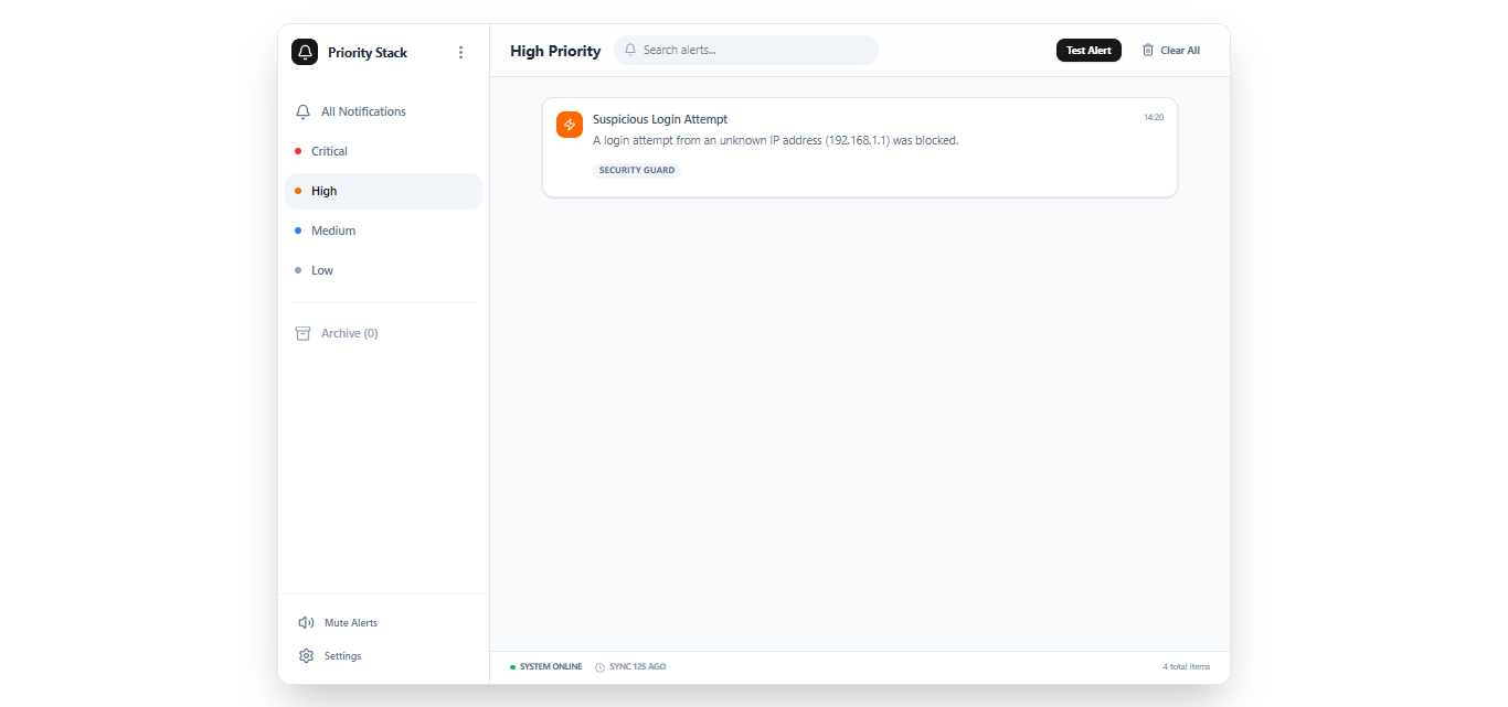 Một hệ thống thông báo ưu tiên hóa cảnh báo dựa trên mức độ khẩn cấp và mức độ liên quan. Những thông báo quan trọng sẽ được giữ hiển thị, trong khi các cập nhật ưu tiên thấp sẽ được xếp hàng yên lặng. Người dùng có thể tạm hoãn, lưu trữ hoặc tùy chỉnh thứ tự ưu tiên theo nhu cầu.